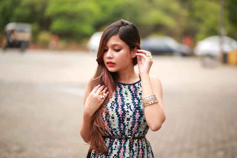 This dress is from Missamore and I loved the chirpy print and the colour is so cheerful. This type of dresses are a go-to as they are so comfortable and the loose fit are so apt this season. I tagged these edgy rings from Le Gold Box and bangles from Claire’s. I really can’t leave my accessories in these monsoon also.
