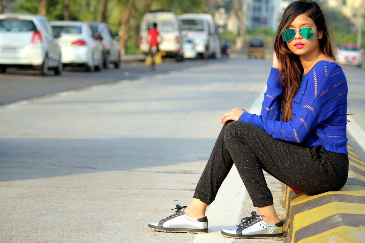 Talking about the look, I again featured a pair of joggers(not like I can’t repeat, but still). As the fall comes closer, we’re looking at warmer clothing and these joggers make it perfectly to my ideal snuggly clothes. As the joggers were already in a darker shade, I went with a brighter/electric blue sweater and added a holographic touch to it. The outfit can be paired with other pieces and but nonetheless is a smart investment for the coming season.