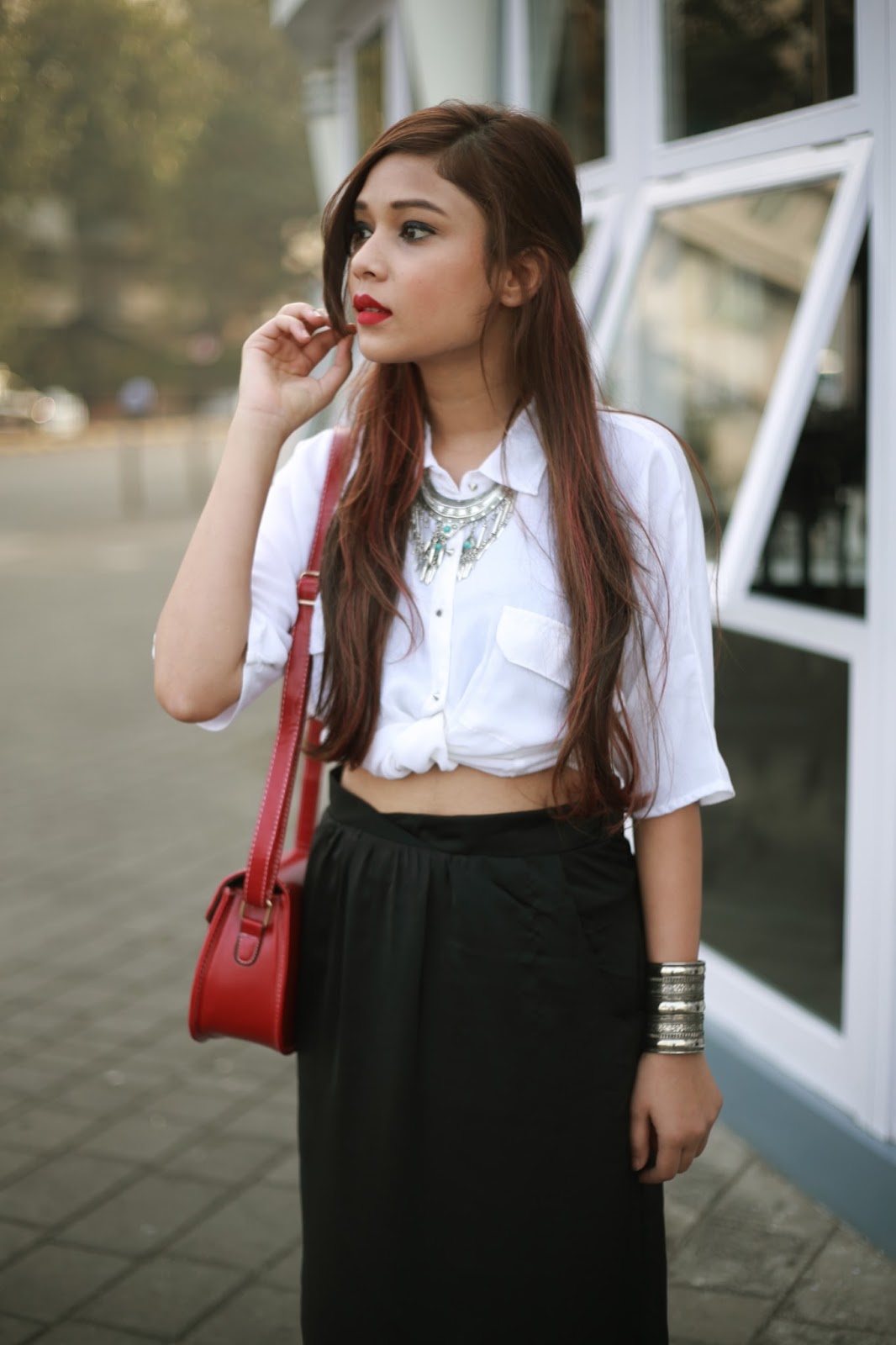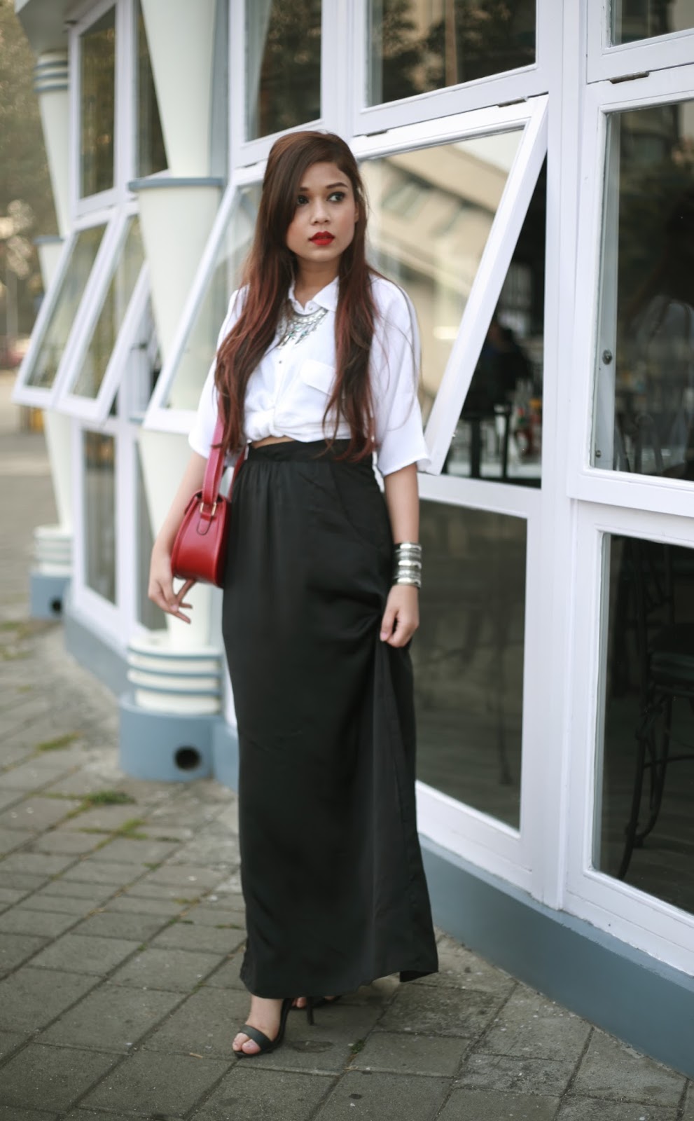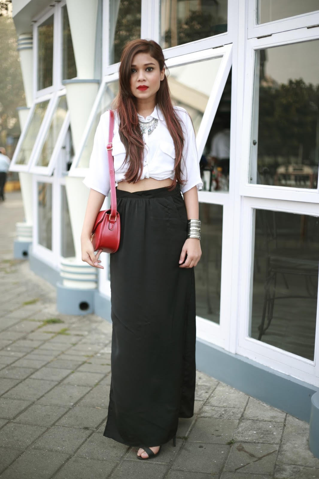 One is the candle light dinner look, where I wore a black maxi skirt with a white shirt and carried a red sling. I wanted to keep the look simple and minimalistic. Just to play around a lil, I added a knot to my shirt to pep it up.