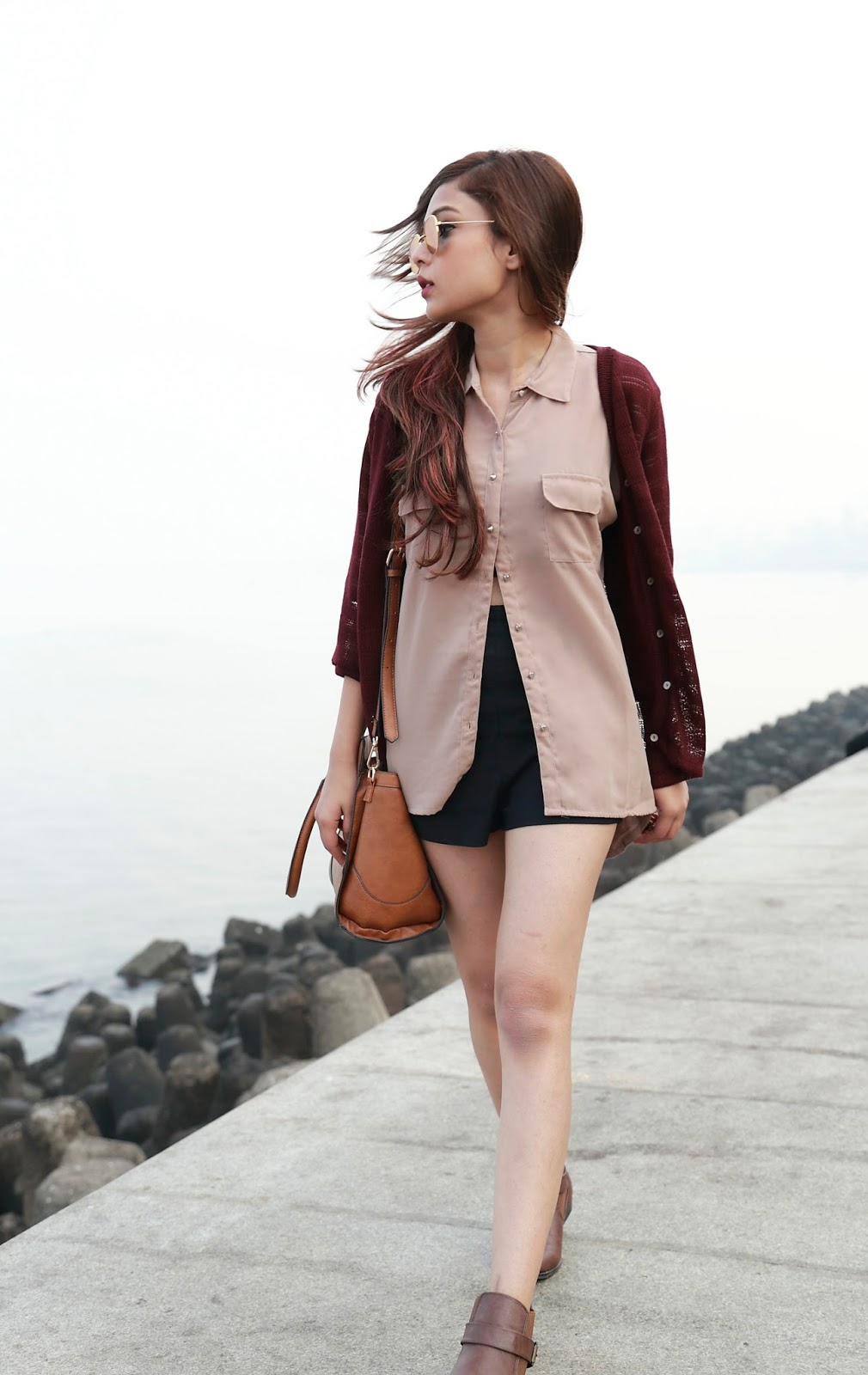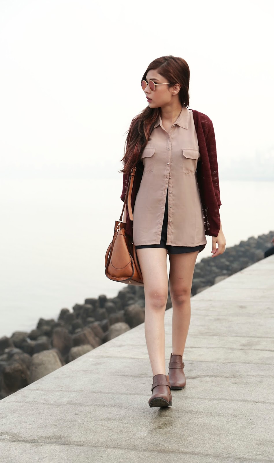 My second look is a shopping-day-out look with my girlfriends and I have kept the look very simple again. I decided to go with a beige shirt with a maroon knitted jacket and paired it with shorts. This look is pretty casual and once a while I do go by it without a statement piece. Hoping to get some agreement from you guys too. Also these boots are my absolute favourite in the shoe collection from fbb.