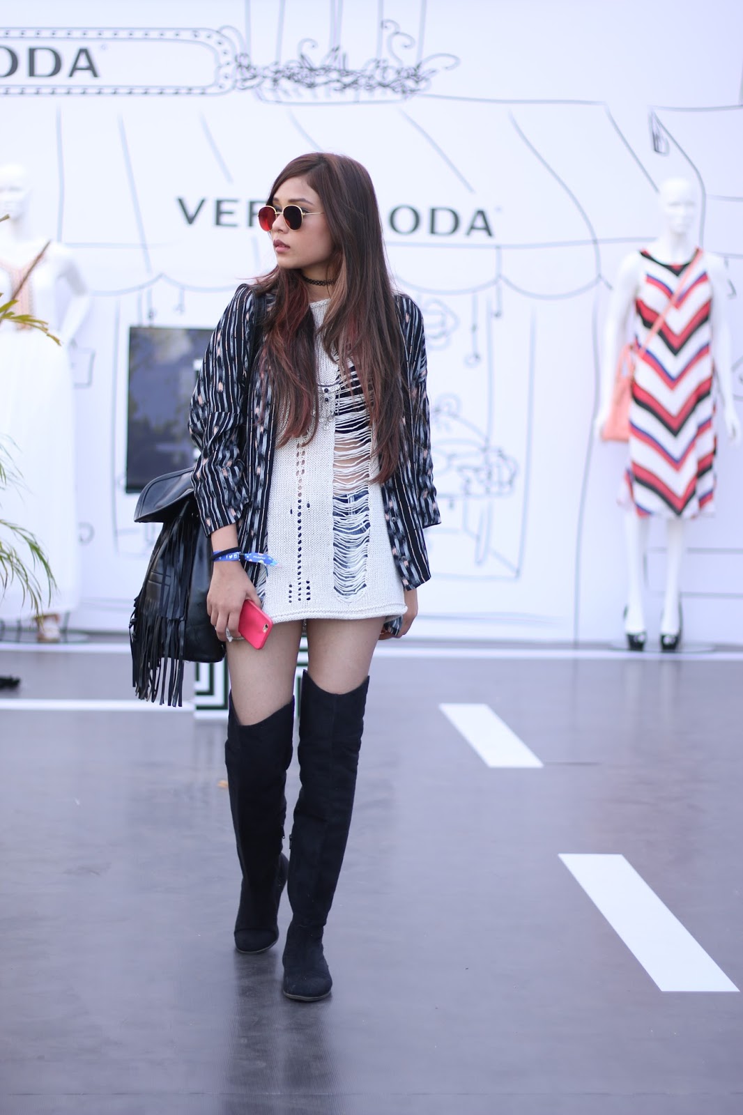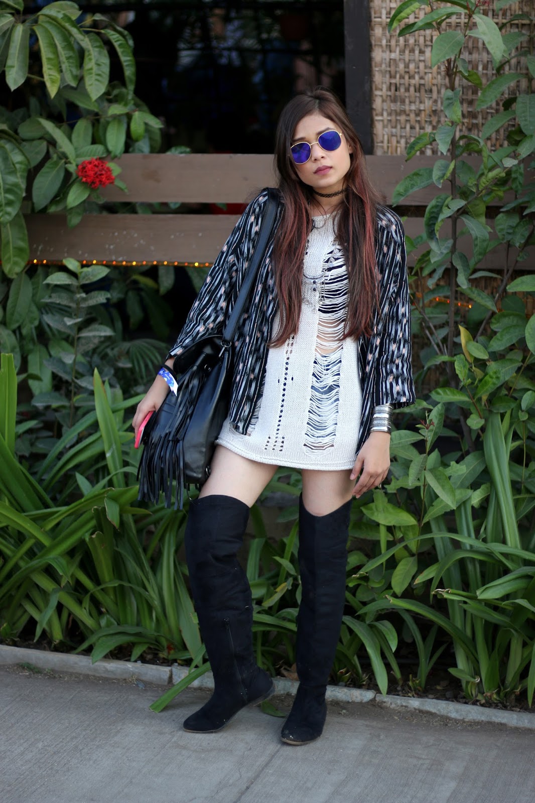 Coming to my look, I wanted to give a boho touch to a rather grunge look. I picked the knitted ripped top and paired it with shorts. I feel ripped clothing is quite a hit at music festivals and has always worked well for me. I tagged a few boho accessories and a printed shirt for layering. Also, I wanted to wear the knee length boots for the longest time, so after much comtemplation, I took the plunge and felt it actually blended well. I did think of wearing a hat too but I am sure I would have looked like a clown with all this jazz already. Haha.