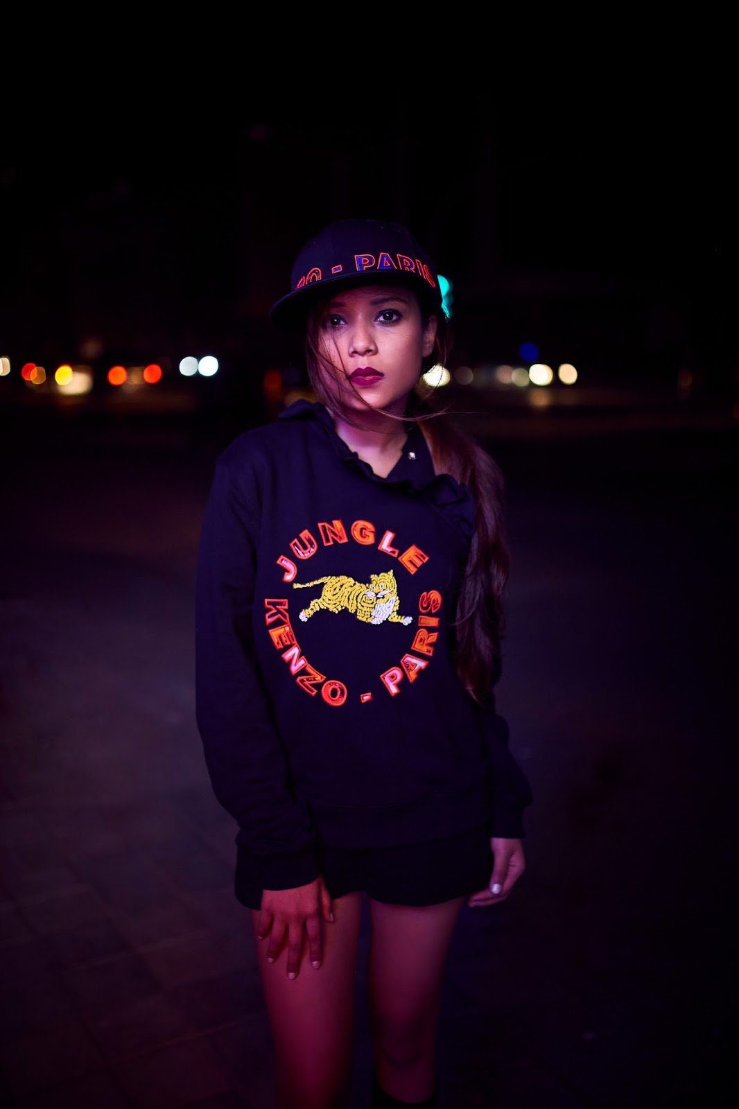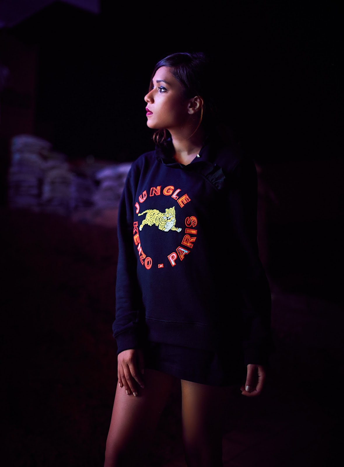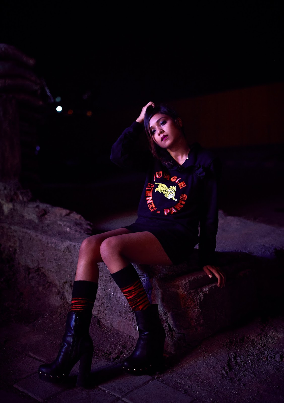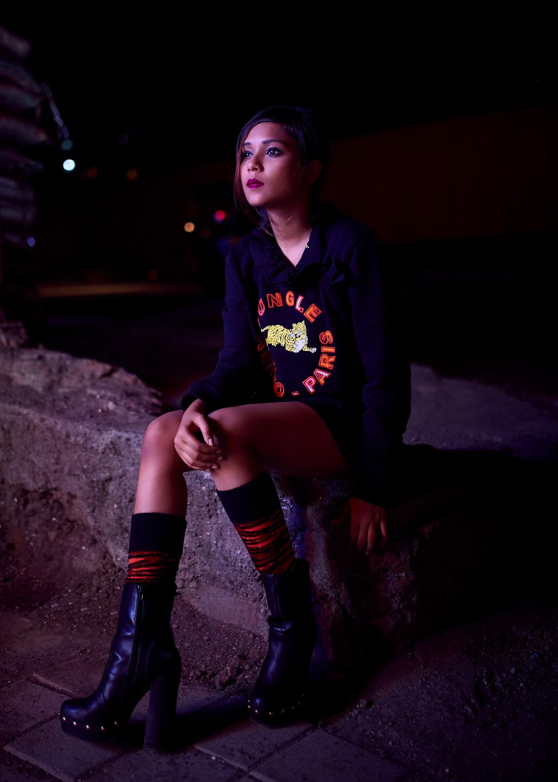 I chose a sweatshirt with a long tee which was almost a dress for me, Teaming up with boots and socks completed my outfit. I love the night shots and they’ve translated the chill yet statement vibe pretty well.