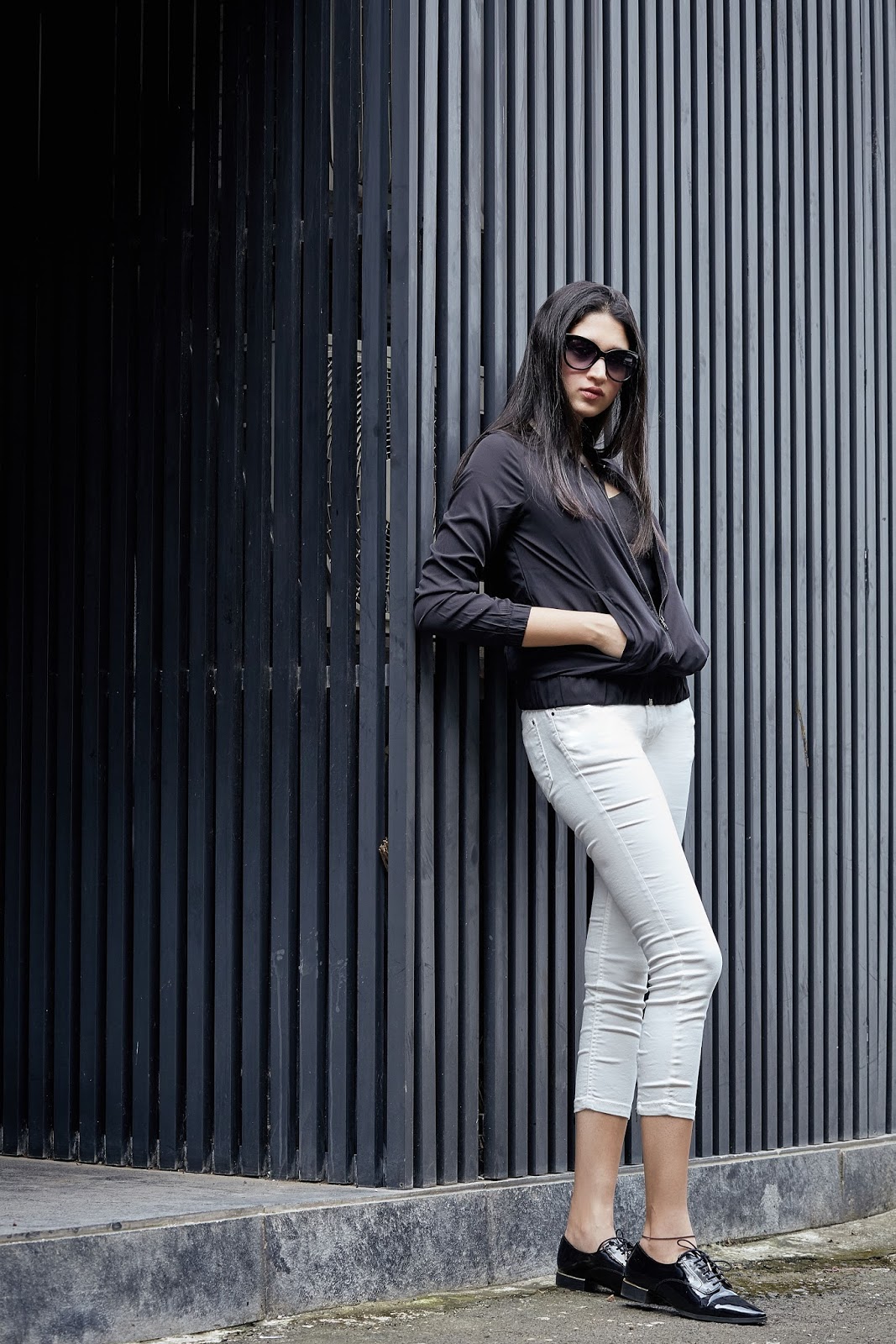 For Shubhangana, I picked a pair of white cropped pants with a black crop top, and she chose a black jacket to go with it. We selected shoes to finish her look.